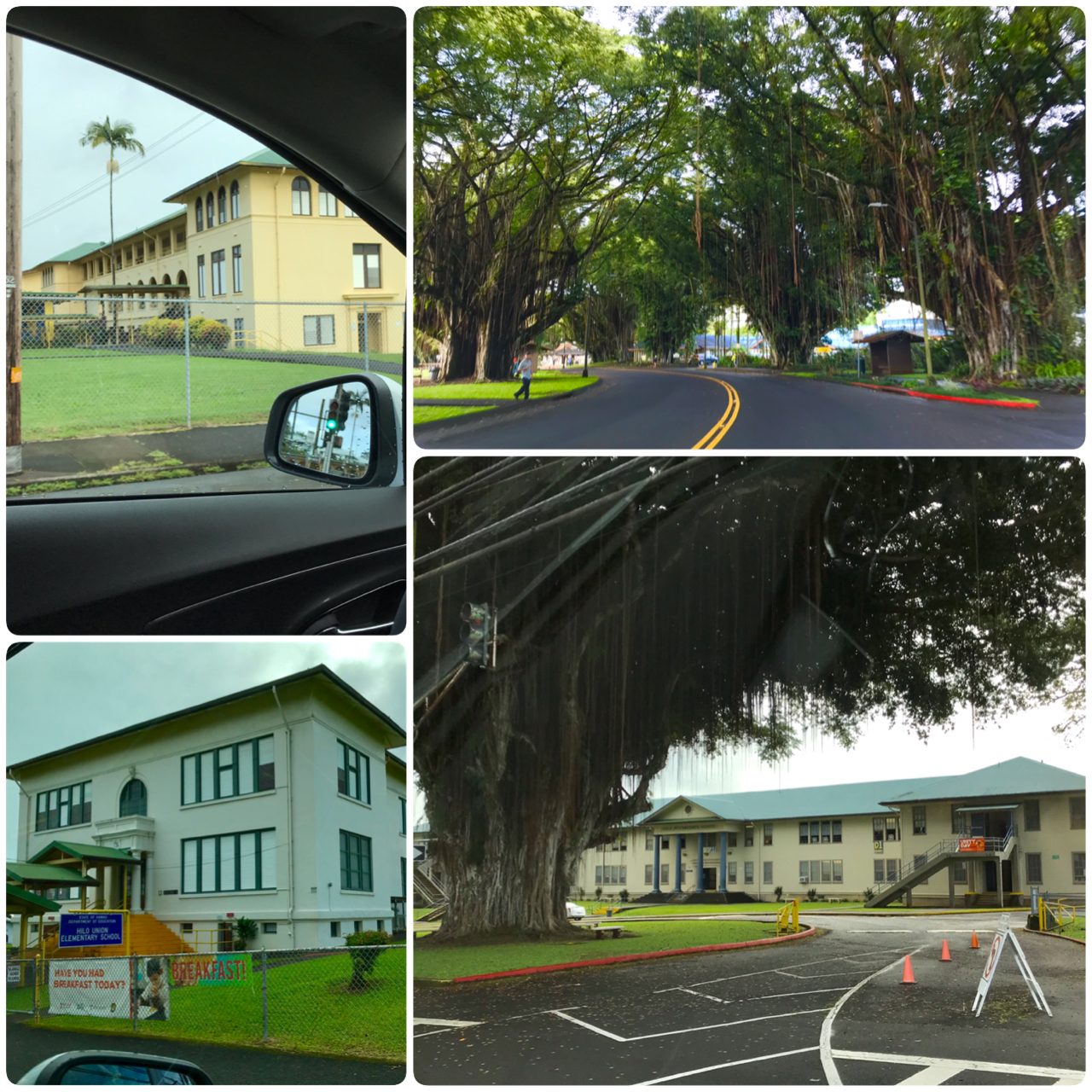 Random photos of banyan trees and schools in Hilo.
