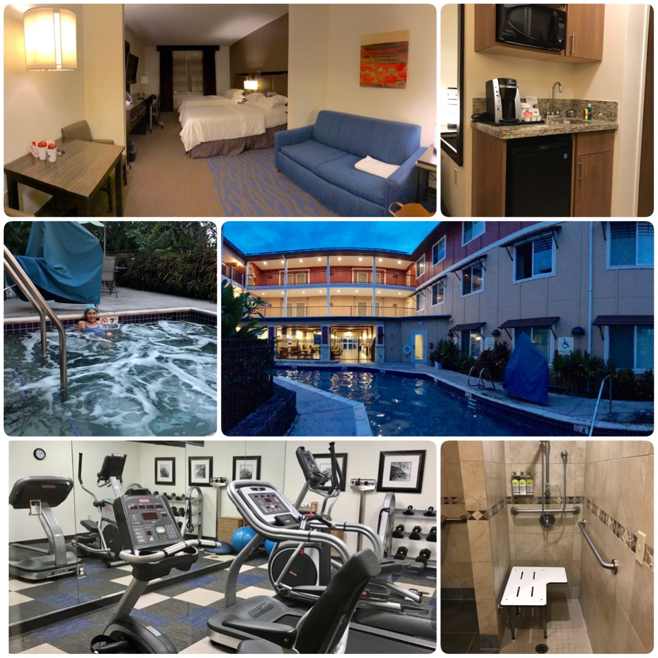 We returned to Holiday Inn Express Kailua-Kona for the last 4 nights of our trip. This hotel was a good base for sightseeing around Kona and west side of the island. We requested for an accessible room but the hotel didn't have any available. However, they did give us a slight upgrade to a bigger room. I liked this hotel because they provide microwave in the room too. Mom was the only one who fully utilized the pool and jacuzzi everyday. The washroom by the pool is an accessible toilet/shower so dad used this washroom for his showers. There is also a very small gym in the hotel but we only used the water cooler in the gym to fill up our bottle. =P