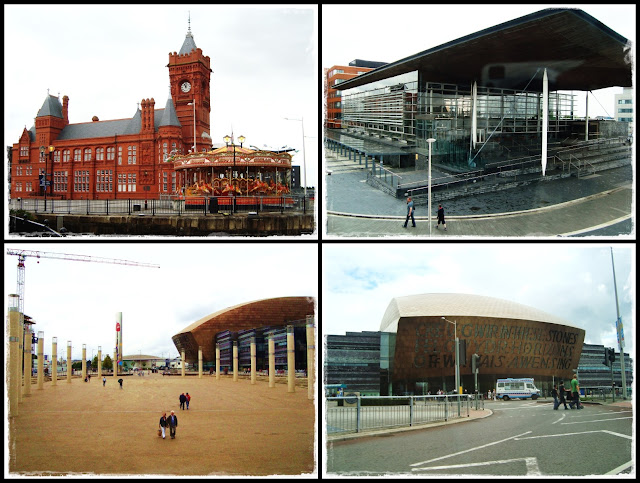 Clockwise: The Pierhead Building, The Senedd/National Assembly building, Wales Millenium Centre, Roald Dahl Plass.