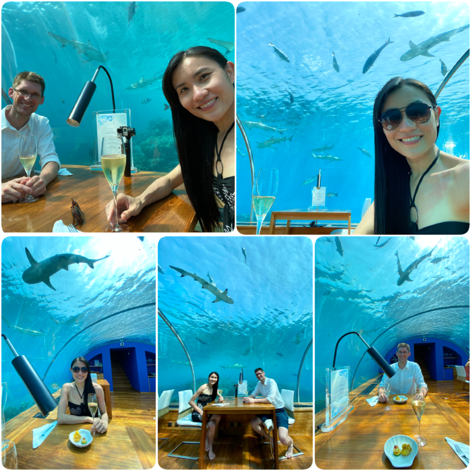 Ithaa is located on the main island and it's the world's first and only all-glass undersea restaurant. We are not foodies so the only reason we are willing to pay for a 'meal' here is for the experience and photo op. The cheapest option is to visit during the cocktail hour from 11am-12pm. For $110 per person including tax, we got 1 champagne, 1 canapé, and 1 hour to take as many photos/videos as we wanted. =P
