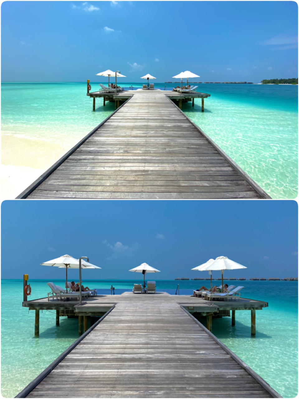 We booked the water villa for the first 3 nights and were given room 317 (2nd from the left in the photo above). As the lobby is on the main island (Rangalifinolu) but the water villa is on Rangali island, we hopped back onto the buggy and Jamie took us to the other island. She told us that we could take our mask off and won't need to wear mask on the island for the rest of our stay. =) All staffs were required to wear masks at all times though.