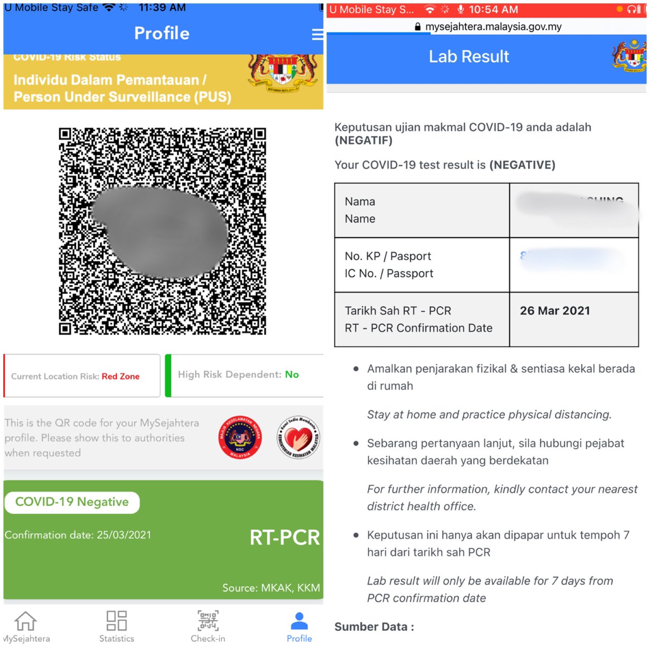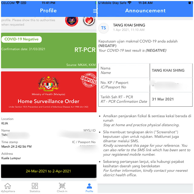 I also received the results of the PCR test I did in KLIA on Day 3 via the MySejahtera app. All is good with a negative.