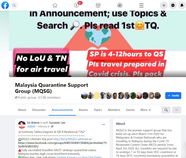 This is an extremely helpful resource for all individuals who plan to travel to Malaysia during COVID-19. The admins constantly update this page with all the latest information and answer questions on a voluntary basis. Many travelers also share their travel and quarantine experiences on this page. I was able to find all the information I needed to prepare for my trip by checking the Announcements and using the Search function.