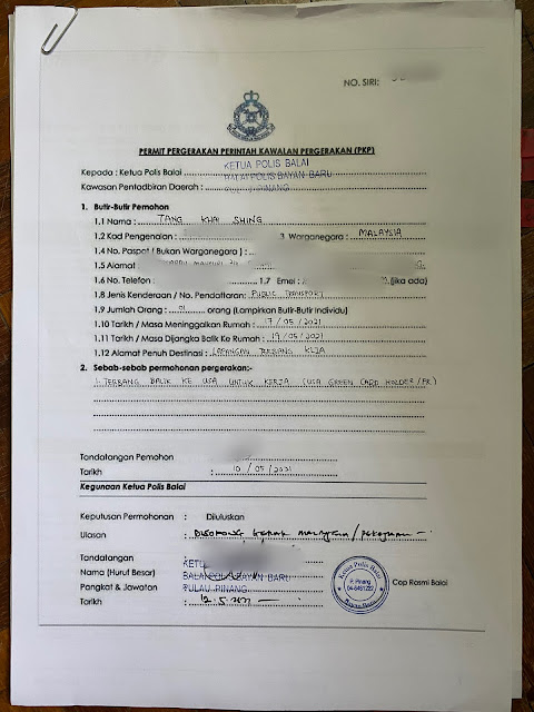 As I had to travel domestically from Penang to KL to board my flight, I had to obtain an Interstate Travel Approval from the local police station. The process was fairly easy and the police only asked a few questions about my job, not really for the approval but more so because they were nosy. I brought along copies of my US Green Card and my flight itinerary just in case. I was asked to provide this letter upon check-in at Penang airport.
