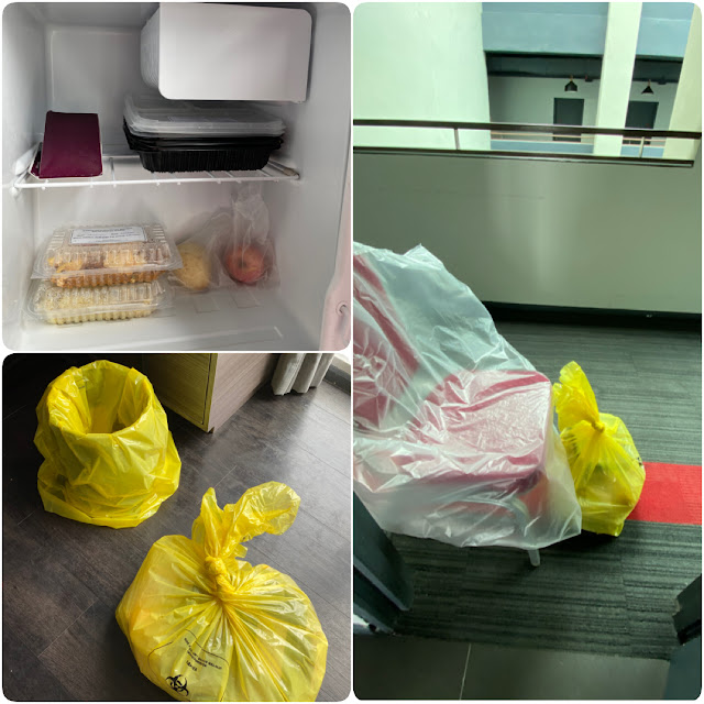 We were provided with a yellow 'biohazard' trash bag everyday for our garbage. I didn't want to be wasteful so I'd keep my leftovers in the fridge for 1-2 days before consolidating them into a trash bag and left them outside my room for the staff to collect.