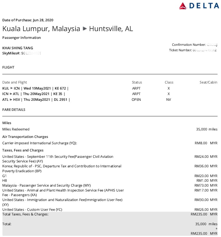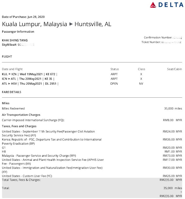 My return flight from Malaysia to US was booked last June. Even though our travel plans had changed multiple times since then, I held on to this booking and was glad that there weren't any major changes or cancellations for these flights. I used 35,000 Delta miles to redeem for the flights from KL - Incheon - Atlanta - Huntsville, with the long-haul flights on Korean Airlines.
