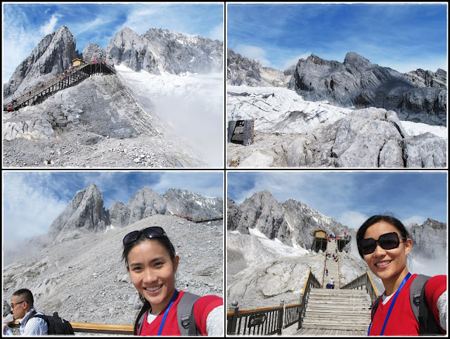 Notice many people wearing 'red' jacket?? There are two 'essential' items that all tour groups encourage tourists to buy/rent before going up Mt Yulong...oxygen & winter jacket. I guess you'll only see this trend in China. I've been to the Alps in Switzerland and hiked Mt Kinabalu, nobody ever mentioned about getting an oxygen tank. Anyway 'just in case', we bought an oxygen tank in Lijiang old town for only 20yuan (as compared to 60yuan at the shop that the tour brought us to). Luckily we didn't rent the winter jacket like what most other tourists did coz the weather really wasn't cold at all. These people ended up lugging their jackets as they walked up all those steps making them even more tired and they probably thought it was altitude sickness so they kept breathing from the oxygen tank...lol!! Personally, I don't think its necessary to get these, just bring a windbreaker during summer, follow your own pace and walk slowly, you'll be fine. =)