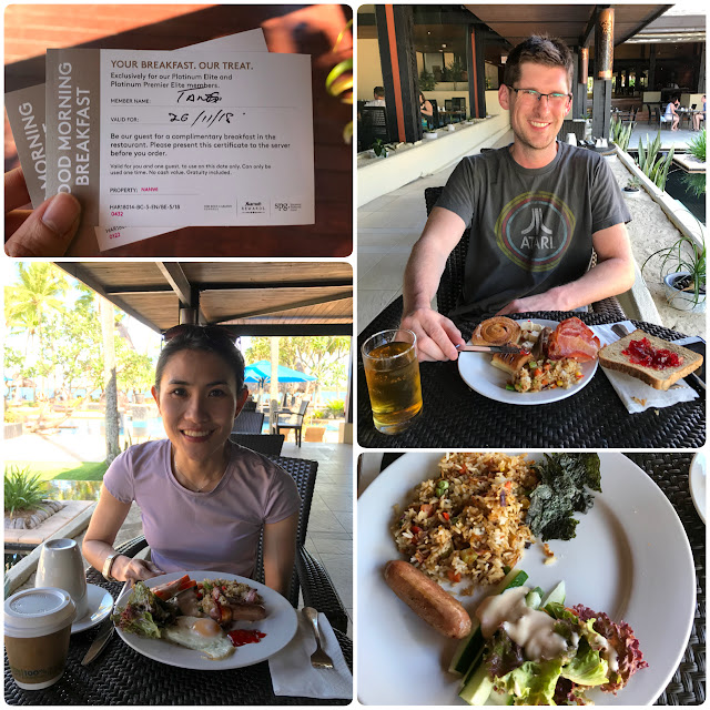 It was only 8.15am when we arrived. Still quite early but the staff graciously let us check in early. Our room wasn't ready yet so they guided us to the Adults-only pool area to freshen up and get changed. The staff also helped to store our bags and gave us vouchers to enjoy complimentary buffet breakfast at the restaurant. I opted for the complimentary breakfast for my Platinum welcome amenity and was supposed to get only one complimentary b'fast for the next morning so this was a good surprise. Thumbs up for the excellent service!! Pardon our haggard look, it's been a long journey from San Francisco.