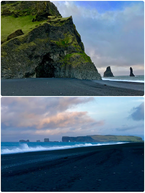 4.45am - Reynisfjara volcanic black sand beach and Reynisdrangar columns. Hubby was seriously reading the warning signs as this beach is known for its deadly sneaker waves and had resulted in fatalities in the past. We kept our distance from the sea, stayed in the 'dry' part of the sand, and made sure that someone was looking at the direction of the sea at all times (in case the waves sneaked up from behind). P.S. I didn't notice this when we were there, but looking at these photos (especially the bottom right one), I wouldn't advise anybody to go anywhere close to the sea by themselves.